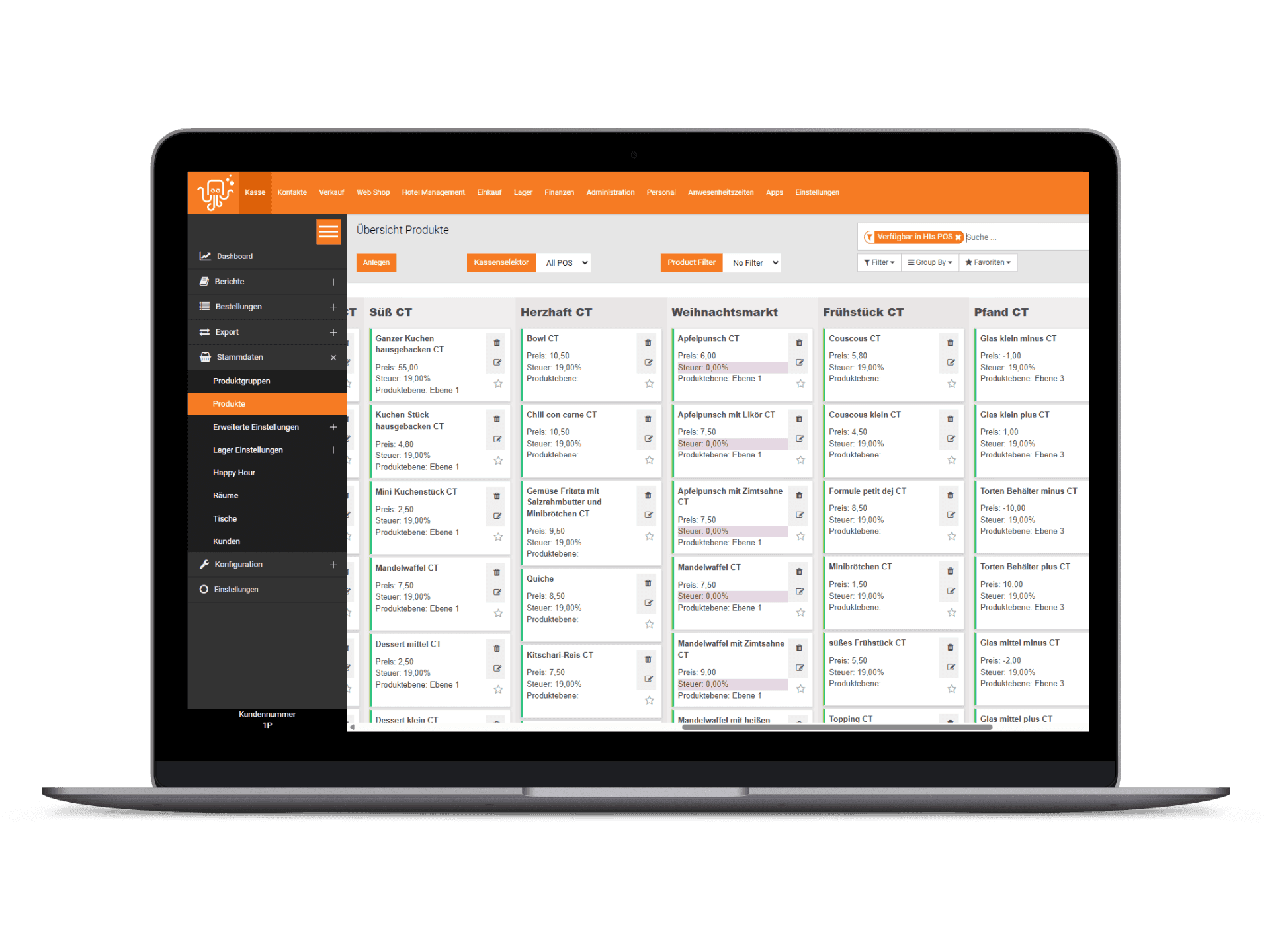 Steuern, Preise, Produktoptionen und Workflows sind pro Bereich konfigurierbar – technisch bleibt es ein System und eine Datenbasis.
