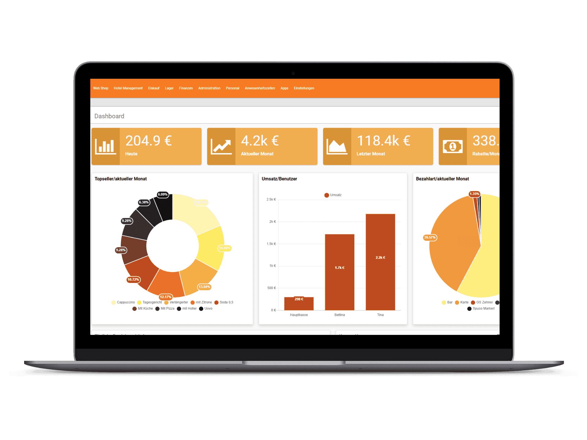 - Performance-Dashboard: Kennzahlen in Echtzeit – Umsätze, Topseller, Warenkörbe, Zahlarten, Stornoquote, Pfandsaldo, Lagerumschlag (falls aktiviert).