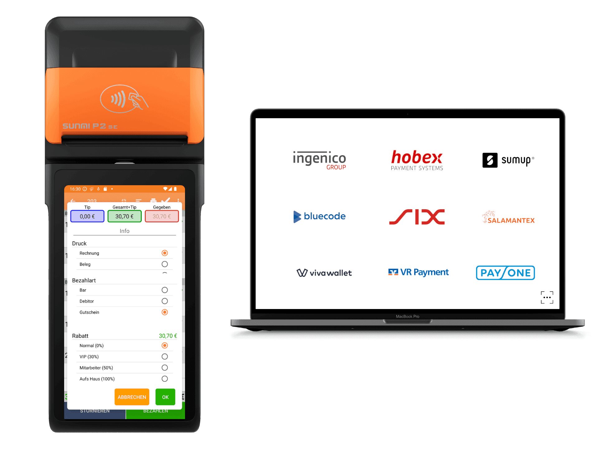 - Breite Netzbetreiber-Auswahl: Unterstützung von ZVT, OPI und weiteren Protokollen – u. a. Worldline, SIX, Concardis, Hobex, Viva Wallet, SumUp.